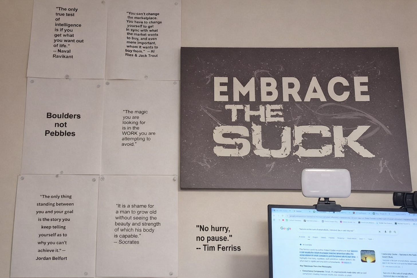 20) On the wall in my office, I also have quotes that change periodically over time. Again, these are messages I want to embed deeply in my subconscious: