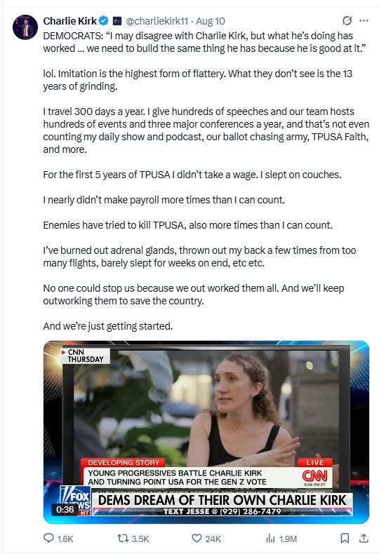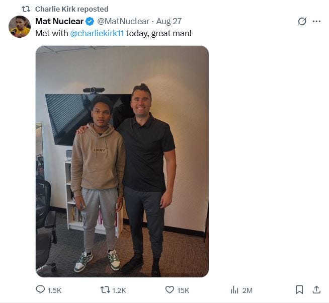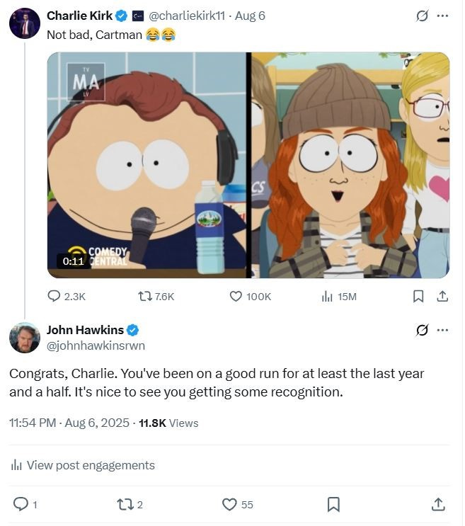 When I first started following Charlie Kirk, I basically wrote him off as just another conservative influencer trying to get his name out there. However, both of us followed each other (which is not as cool as it sounds because he followed A LOT of people) and as I got to see more and more of what he was doing with TPUSA, his debating on college campuses and the amazing job he did during the 2024 election, I grew to appreciate his work a great deal. After South Park did an episode parodying him, which he liked by the way, I told him so.