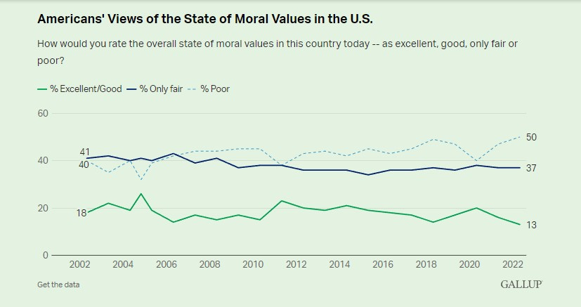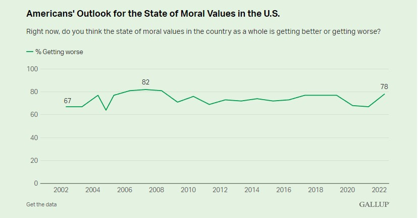 It’s not a pretty picture. Do we have the least moral society of all time? No, but you have to think we’re now historically in that bottom quarter of nations. We may not be as bad as the worst of the Roman Empire, the current Palestinian territories, the Aztecs, the Mongols under Genghis Khan, the Taliban, or the Nazis, but we’re also a society that absolutely no one should be trying to copy morally.