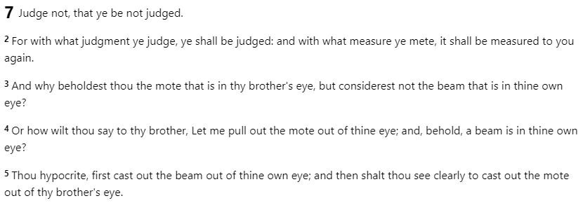 People, usually with guilty consciences, often like to pretend that this Bible verse is telling us not to make moral judgments. That is incorrect. On the contrary, this verse is telling us that we need to be good and moral ourselves, so we’ll have the ability to step up and tell other people what they’re doing is wrong. You don’t have to never have fallen short. You don’t have to be perfect (which is good since none of us are), but you do at least need to make a good-faith effort to do the right thing, so you’ll have the credibility to call out bad actors – and we need that desperately in this country.
