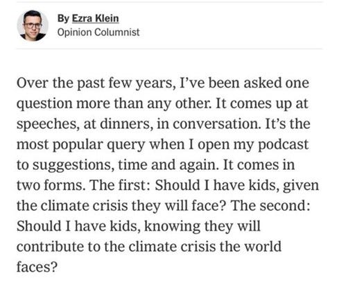 * Ezra, Ezra, Ezra. This piece reads as a well-written attempt at rationalizing your way out of the guilt of being one of the most privileged procreators on earth. You and Steven Pinker share the tone-deaf luxury of being able to reframe anthropogenic biosphere collapse in terms of techno-optimistic progress.