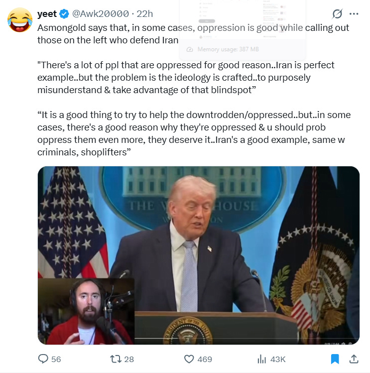 It could also be because conservative “intellectuals” seem to have dropped off in quality after people like Thomas Sowell, Walter Williams, and David Horowitz left the scene, while many other prominent influencers on the Right have become so focused on chasing traffic that they just don’t bother with much harder to monetize original thoughts. Whatever the case may be, Asmongold has a gift for describing issues in a way most other conservatives don’t.
