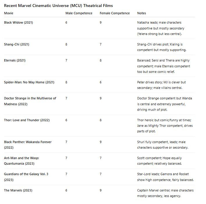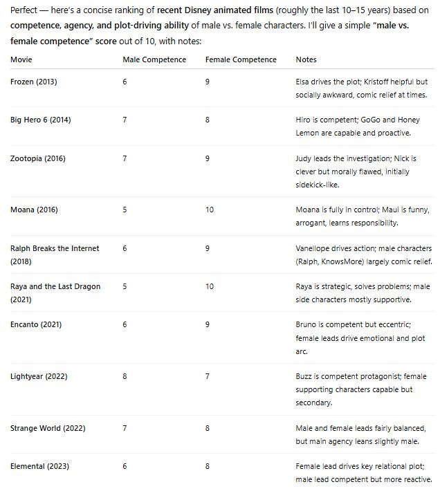 Some of their movies were just poorly written, but they’ve also started creating a lot of “girl boss” characters that are portrayed as being amazing without ever having to struggle to get there, while many of the men are portrayed as bumbling, incompetent, non-serious, or comic relief. Just to give you a sense of it, I actually asked ChatGPT to quantify this. This is what it said: