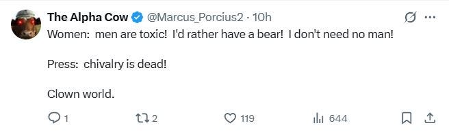 Incidentally, we’re not talking about handing a man a gold coin every time he opens a door for a woman here. We’re talking about things like a minimal level of appreciation. Like feeling as if being chivalrous sets them apart from other men in a good way. Like believing that being chivalrous says something positive about them as a human being. If men conclude that being chivalrous isn’t valued at all, is going to lead to them catching flak from women, or could even lead to them being prosecuted like Daniel Penny if they defend a woman in trouble, their attitude is going to be, “No thanks.”