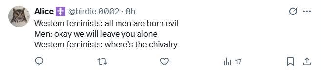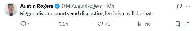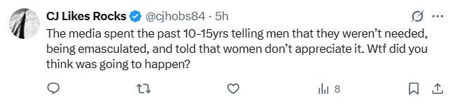 There are also some men who, fairly or unfairly, have come to conclude that women are increasingly hostile to most men and that the rules are rigged against them. Is there some truth to that? Absolutely, although we can argue about how widespread that issue is across society. Just to give you the gist of what men like that are saying, I wanted to include some comments from the article on X. You can make your own judgment about how valid these sentiments are:
