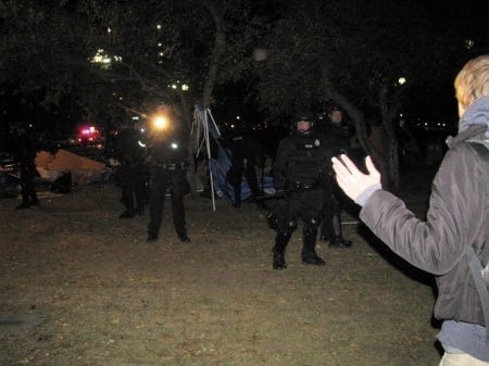 We heard that the police were going to throw them out of the park that night and decided to cover it. Most of the people I was with covered it from across the street, but I wanted to be right in the middle of the whole melee between the cops and protesters to get a better view of what was going on for the story I wrote. I had a cop point a gun at me (the one with the flashlight):