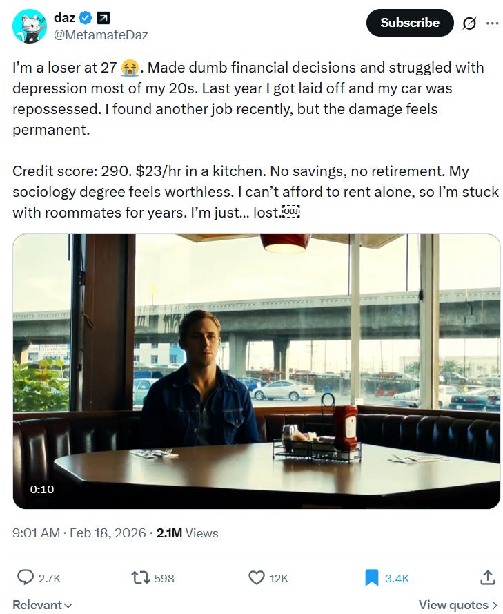 The brief story you are about to read comes via X, and it seemed worth talking about because, pretty clearly, there are a lot of people today who can relate to it. They feel like they’ve gotten behind in life, they’re in a hole, and there’s no obvious way out of it. They feel bad about where they’re at, and they aren’t really sure if it gets better from here.