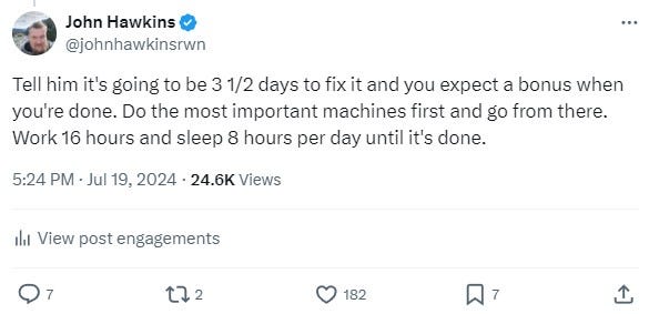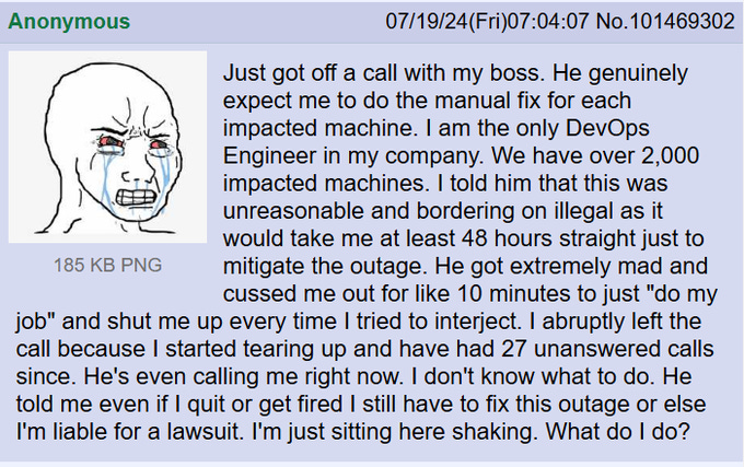 Even in the short term, you can make yourself invaluable to your company if you see a crisis that you can handle with your work. That’s what popped into my head when I read this panicked, hopeless missive from some poor IT guy after the CrowdStrike global tech crash disabled every computer in his company: