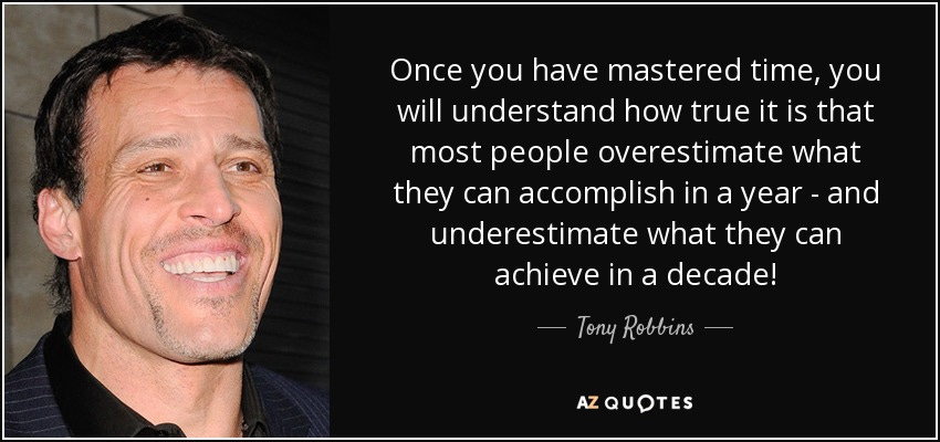 Not only does this quote lead us to think about the long-term results of our actions, which we humans are often terrible at doing, but you can further parse it down and still have the quote be true. Most people overestimate what they can accomplish in a day, but underestimate what they can accomplish in a week. They overestimate what they can accomplish in a week, but underestimate what they can accomplish in a month. They overestimate what they can accomplish in a month, but underestimate what they can accomplish in a year.