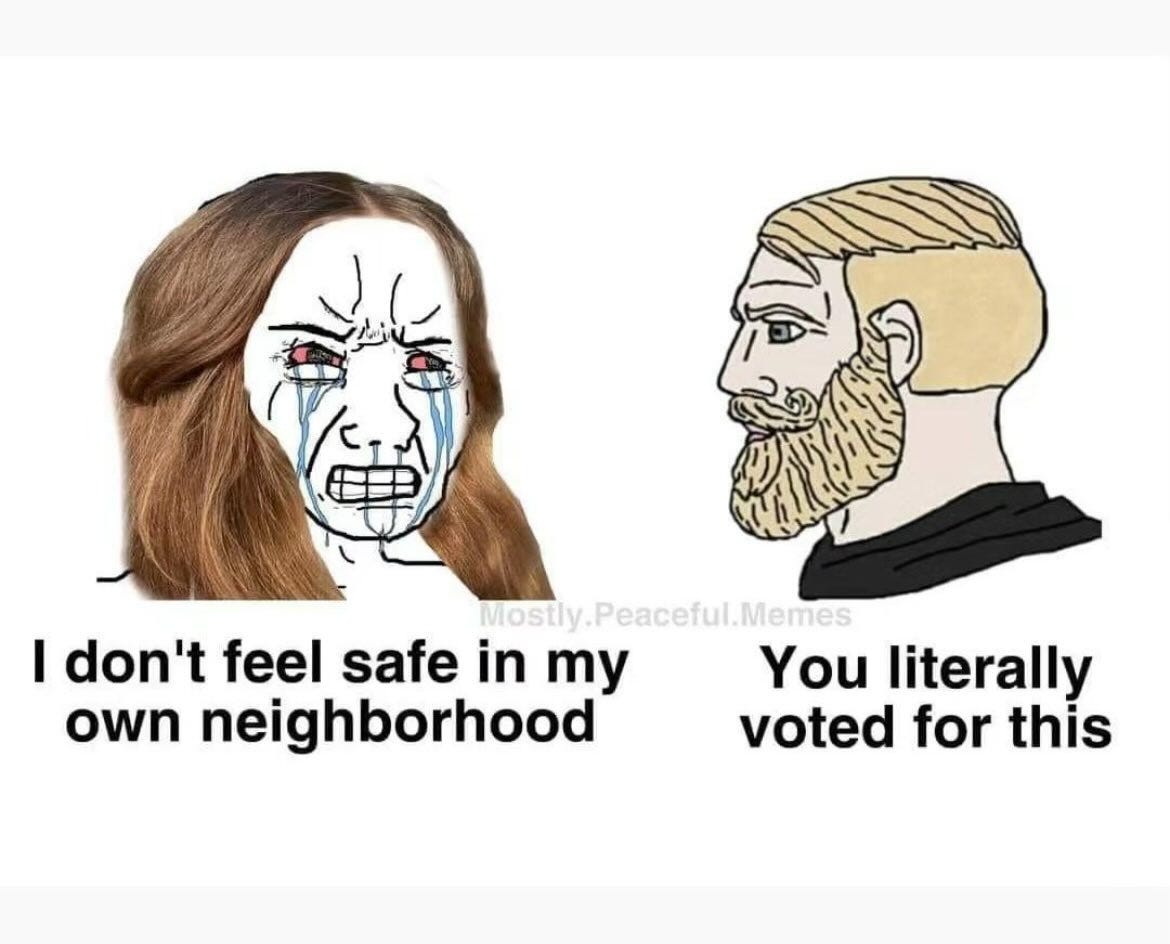 It would be one thing if liberals looked at all of this, thought it was outrageous, and voted the people responsible for these disasters out of office, but the truth is that run-of-the-mill liberals don’t care whether their policies work or not any more than liberal politicians. This is why memes like this exist about the crimewaves that have happened in liberal cities since Trump left office: