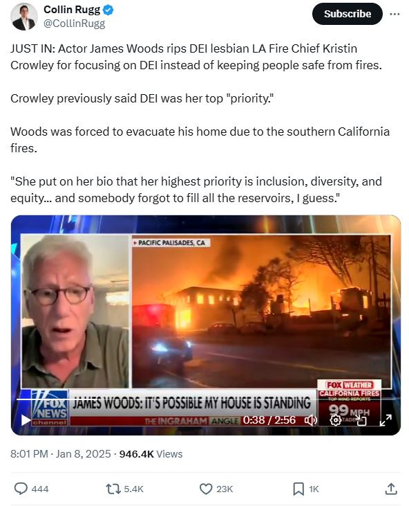 “I have just noticed that for the last two weeks, every emergency or law enforcement chief I’ve seen on TV is a woman. And they are presiding over the worst disasters that this country has seen in decades at least. Every single one of them looks and sounds incompetent. Looks and sounds like a DEI hire. Looks and sounds like the least inspiring leader you’ve ever seen.”