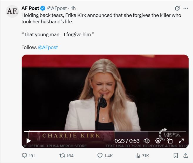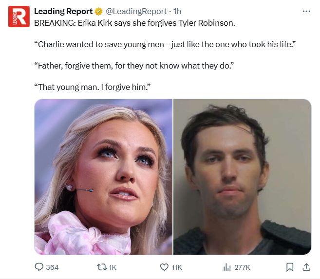 I was thinking about that when I saw Erika Kirk’s comments about her husband’s killer at his memorial service, which was attended by over 200,000 people by the way.