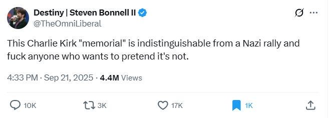 Notice the 4.4 million views on a tweet by a popular liberal influencer comparing a Christian memorial service for someone they murdered to a Nazi rally. Incidentally, this is right after a liberal murdered Charlie Kirk and wrote the title of an anti-fascist song and “Hey fascist! Catch!” on his bullets.