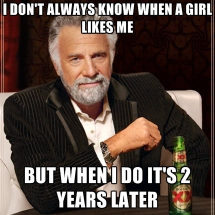 5) Almost every girl you think likes you, who isn’t making money off of being nice to you, actually does: When I was a teenager, I was really, really bad with women. Even when they were practically waving me into the hangar, I still had no idea what was going on. It was like I was blind; they were doing sign language and I didn’t know what was happening. Then, a funny thing happened. After regularly working on it by talking to women and learning about the subject, I started to get good at reading the subtle signals ladies throw off, but I had no confidence that I was right. It was like those dumb memes: