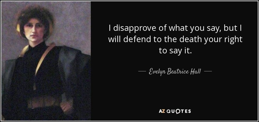 Meanwhile, Americans may not have ever quite lived up to it, but our ideal has been much closer to that famous quote often attributed to Voltaire: