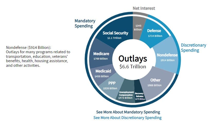 If you want to see what this kind of thinking leads to in practice, you can start by looking at this pie chart from the CBO that shows a breakdown of federal spending in 2020.