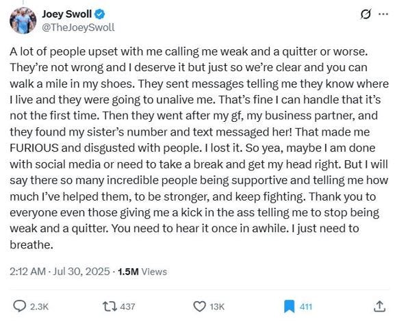I was thinking about that as I saw Joey Swoll, who’s one of the real good guys in the fitness space, badly mismanage getting attacked by an online rage mob.