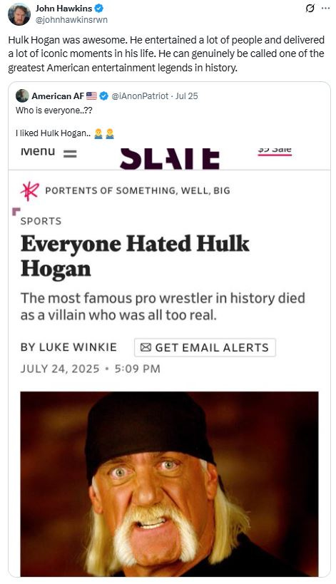 So, the heat turned up on Joey Swoll, and he tossed Hulk Hogan under the bus and apologized, which, almost comically, led to him then being bitterly criticized by conservatives for apologizing: