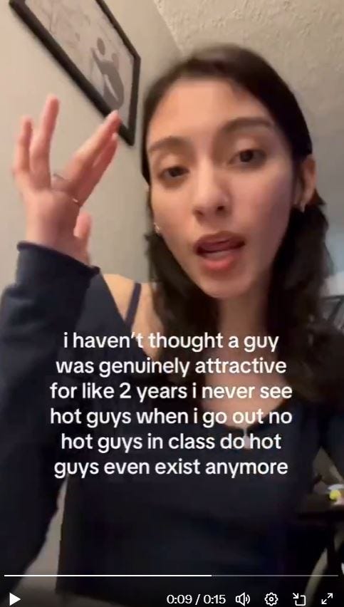 Meanwhile, what men are women constantly exposed to online? The absolute tip of the spear. The billionaires, celebrities, professional athletes, and Instagram models. This gives them the impression that men like that are everywhere, when in actuality, they might go years or even DECADES without meeting a man like that. I thought about that when I saw this video from a woman who said she hasn’t seen an attractive man in two years: