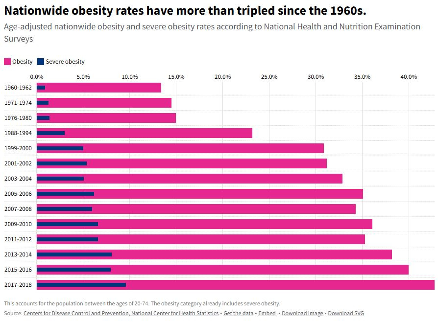 Certainly, there are obese people who date and some people who look much better than others carrying a lot of extra weight, but almost nobody gets more attractive by adding an extra 50 pounds. Put another way, many obese people have trouble getting dates, and in the last 60+ years, their numbers have tripled. So, a lot of people that would otherwise be happily dating right now are left on the outside of the dating market looking in.