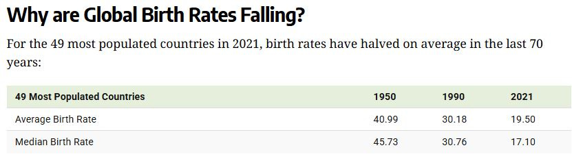 In fact, in many countries, including the United States, the birth rate has fallen below the replacement rate, meaning that we’re having so few kids the population is dropping. Many people have speculated about what’s causing this and you can even read about that in more detail here at Culturcidal.