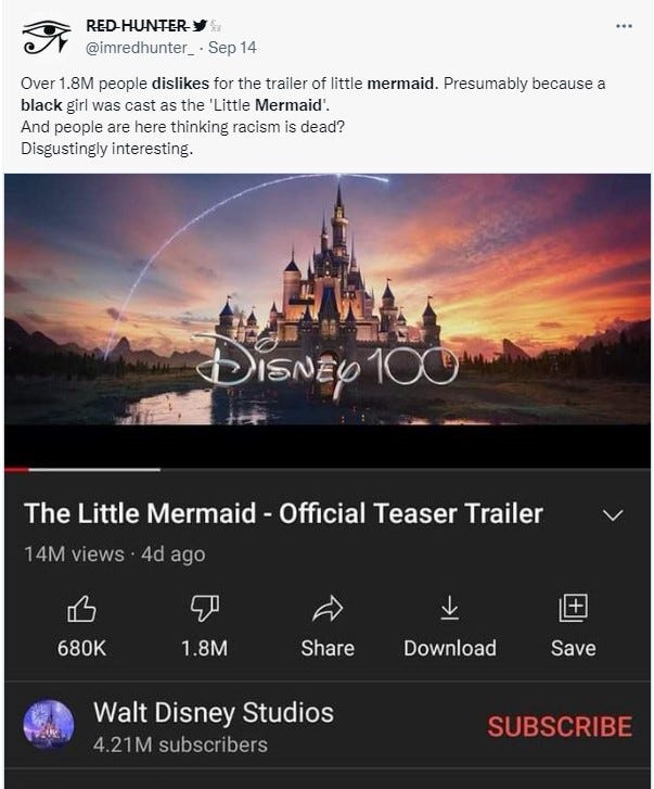 First of all, the Little Mermaid reboot doesn’t come out until May of 2023, so you might say we can’t give it a fair evaluation, but people have seen this kind of thing play out repeatedly. Everyone knows we’re probably not going to get anything fresh or new. We’re probably not going to get some creative retelling of the story, like say, the way Wicked revised The Wizard of Oz. What we are likely to get is a mediocre reboot of the Little Mermaid mixed in with lots of scolding and virtue signaling. “Go see the Little Mermaid to prove you’re not racist.” “Oh, you don’t like the new version? You must be racist!” It’s not just meant to be entertainment; it’s meant to be politics mixed with entertainment. It’s not meant to be creativity; it’s meant to be a substitute for creativity.