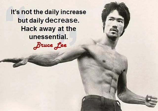 Similarly, how many time sinks do you have in your life? You know, people you hang out with that you don’t care about and repetitive tasks that you’d rather not be doing. How do you do LESS OF THOSE things? Spend LESS TIME around those people? This is what Bruce Lee was driving at when he said: