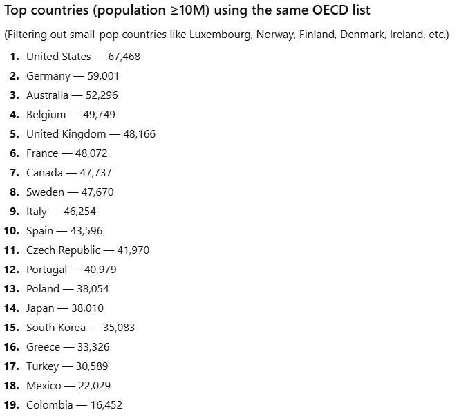It’s worth noting that even though the United States came in first, it’s really not fair to compare a nation like the United States to countries the size of a postage stamp. When you compare the US to larger nations with more than 10 million people, we do even better: