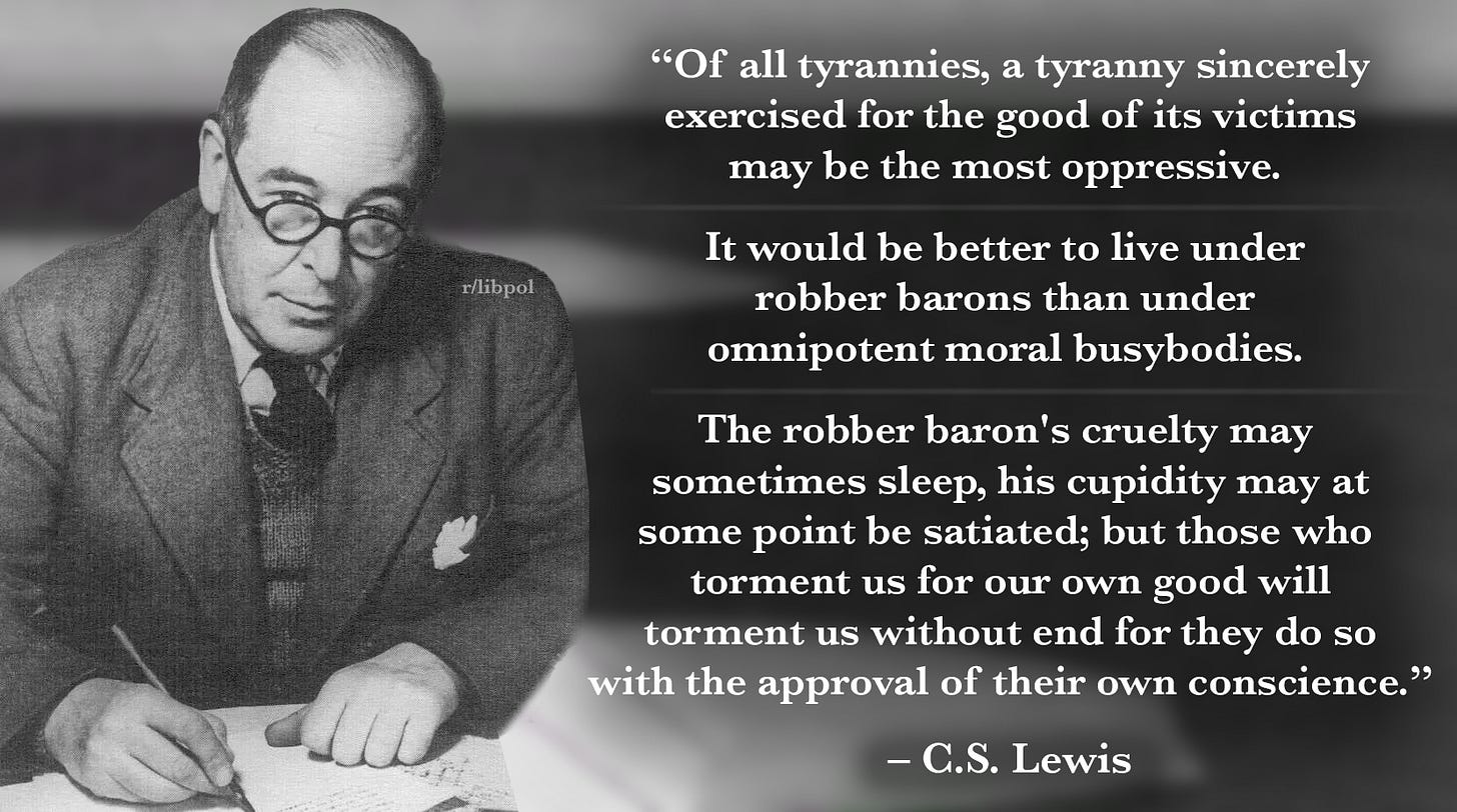They’re not good guys. They’re not trying to help, they’re just self-interested – still, it could be worse. How, you ask? Because there’s another strain of big government advocates who like the idea of using government to force everyone to do things they wouldn’t voluntarily do for “their own good.” They’re the sort of people C.S. Lewis talked about when he said: