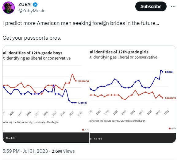 What he’s talking about in this video is that the old script so many Americans are trying to read off of on relationships no longer exists in a fundamental way for a lot of women. Because of birth control, abortion, and government welfare, women no longer live in terror of having a baby outside of marriage. Women are working now, so they no longer NEED men to support them or their kids, and taking care of a child solo may statistically often lead to bad outcomes, but it has also been normalized. In other words, a lot of women may WANT a man, but they don’t feel like they NEED a man. If you want to know one of the biggest reasons why the divorce rate in America is pushing up towards 50%, this is it.