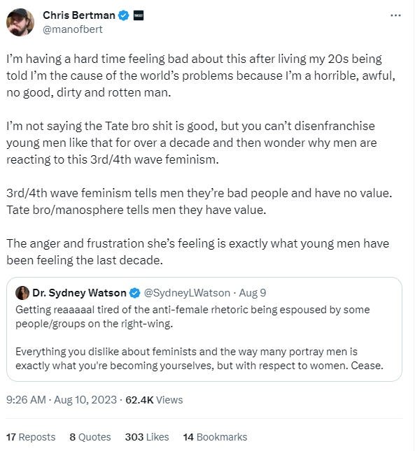 Anyone who has read my work probably knows I’m not a fan of Andrew Tate, but if this is how a lot of men see life and he’s claiming that he can teach them to be the ones getting “all the p*ssy” instead of “no p*ssy.” Can you see the appeal? Can you see why these men might appreciate someone like Jordan Peterson giving them advice on how to navigate the difficult world they see in front of them? If you’re an 18-year-old man, which message sounds more appealing, the conservative message which is essentially, “Masculinity is good, you have a lot to offer the world and we think you can succeed” or the liberal, “The world’s problems are being caused by cis-white men like you!”