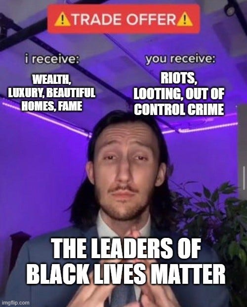 The grift lives large, expensive and expansive lives off the lie that Americans i.e. white people are racists. BLM is a racist organization and as such racists do what racists gotta do.