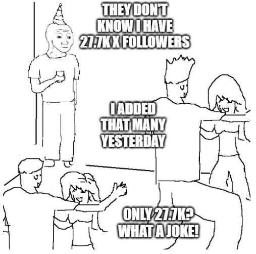 Additionally, if you follow me on X, you know I have 27.7k followers. Sound impressive? Well, IT IS. According to X’s Grok AI, “approximately 0.005% of X users have more than 27,700 followers.” In other words, I am like SUPER POPULAR… except, I also recently did a list of the 100 most popular conservative X accounts recently and the LOWEST account on the list had 1.6 million followers. So, it’s really more like: