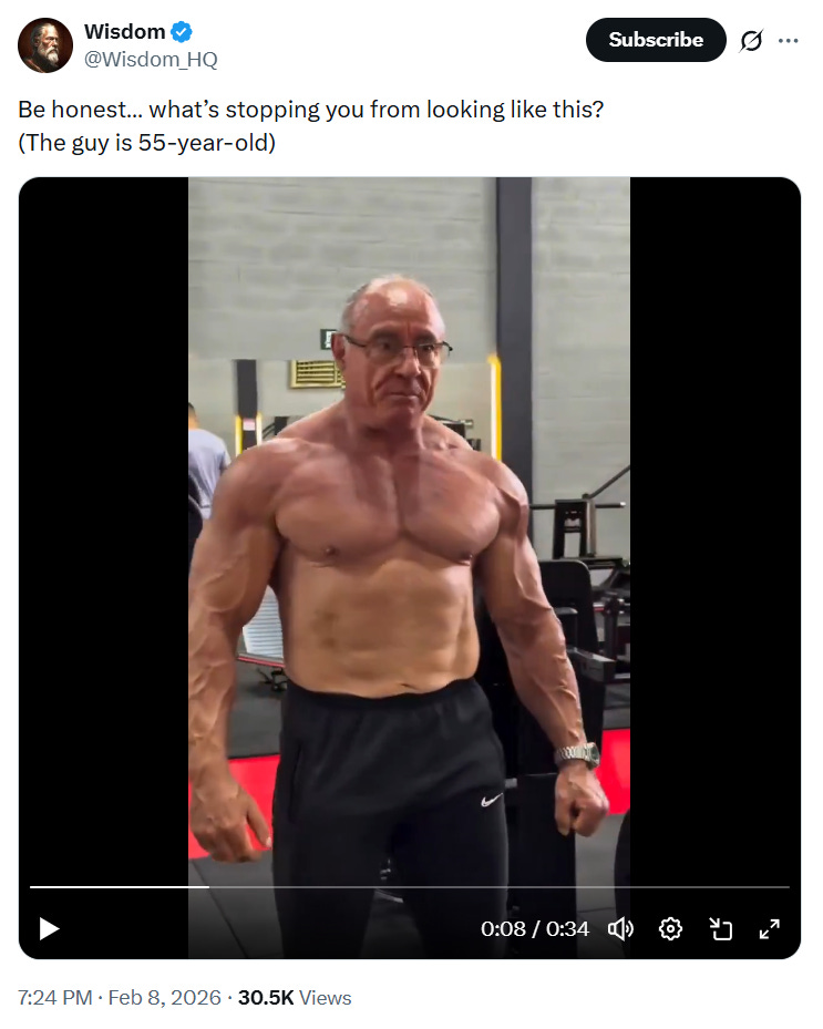 The implication is that you can look like this, but the reality is that you can’t look like him at his age, no matter how much you train, unless you have freakishly good genetics and take large amounts of dangerous drugs.