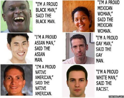 The question really isn’t, “If other races can say they’re ‘proud’ to be their race, why can’t white people say the same?” It’s, “Saying you’re ‘proud’ of your race is usually a sign that you feel inferior and are trying to feel better about yourself by claiming other people’s accomplishments, so why should anyone do that?”